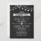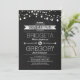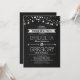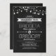 Invitación a la fiesta de compromiso en pizarra negra con una cuerda de luces y tipografía moderna decorada con flechas de amor y acompañada de un cartel angustiado. Invitación perfecta para la temática rústica de fiesta de compromiso con acentos de luces.