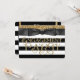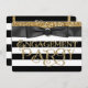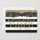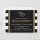 Hermosa corbata de arco negro con audaces rayas blancas y negras y fondo purpurina dorado con elegante invitación a la fiesta de compromiso de guiones purpurinas de oro. Esta invitación a la fiesta de compromiso en negro y oro se personaliza fácilmente para tu evento simplemente añadiendo tus detalles en el estilo de letra y color, y en la redacción de tu elección.