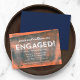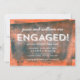 Invitación del Partido de Compromiso Moderno con las palabras "¡Comprometido!" en blanco contra un fondo de patrón de tinta rodada en azul y naranja. La invitación incluye una parte posterior azul. Personalízalo reemplazando el texto del marcador de posición para agregar su información. Para obtener más opciones, como cambiar el tipo de letra y su tamaño/color o el espaciado entre letras, haga clic en el botón "Personalizar". *Tenga en cuenta que la marca de agua Zazzle que aparece en la vista previa del zoom NO aparecerá en el producto impreso final. © Rosewood y Citrus