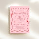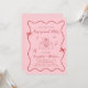Invitación a una fiesta de compromiso rosa y rojo, de inspiración retro, con un marco ondulado adornado con arcos de coqueta y ilustraciones caprichosos de corazones, estrellas y una elegante mesa de boda romántica, y "Partido de compromiso" y los nombres de la novia y el novio en un libreto rojo.