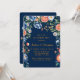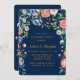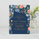 Un ilustracion acuático de un aroma de peonía brillante en azul marino y naranja. El ramo consiste en peonías con grandes flores redondas y hojas verdes profundas. El fondo es azul marino. Las invitaciones coincidentes y los suministros de boda están disponibles en este conjunto de colecciones