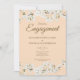 Elegante invitación a la fiesta de compromiso con la flor blanca de bonito con delicada flor de primavera enmarcando los detalles de su fiesta de compromiso con elegantes letras doradas sobre un fondo color melocotón. Personalice los detalles de su evento especial. Diseñado por Thisisnotme©