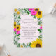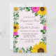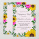 Invitación a una fiesta de compromiso rústica con girasoles vibrantes, margaritas blancas tradicionales y flores rosadas sobre un fondo rosa claro con el aliento del bebé y acentos de vegetación botánica