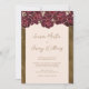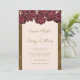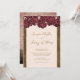 Esta elegante y florida invitación a la participación de bodas presenta un borde de rosas burdeos sobre un fondo rosa oscuro bordeado de oro oscuro. Personalice sus detalles en un guión moderno de caligrafía. La parte trasera de la invitación tiene un cuadro artístico moderno con un jarrón de rosas con tu momograma personalizado. Diseñado por la artista Susan Coffey.