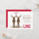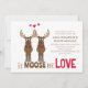 Cute Whimsical Moose diciendo "Moose be love". Este diseño presenta compromiso lindo y caprichoso divertido invitaciones divertidas, perfecto para fiestas bodas comprometidos, una celebración que celebra juntarse, un humor amor al corazón de los animales, moose be love cito, un creativo y único tipo de letra de tipografía, moderno y moderno estilo de luz, esposa de pareja, ilustraciones gráficos personalizados rojos, invitación graciosa al aniversario lindo