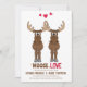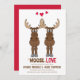 Cute Whimsical Moose diciendo "Moose be love". Este diseño presenta compromiso lindo y caprichoso divertido invitaciones divertidas, perfecto para bodas y celebraciones de pareja comprometidas celebran juntarse, es un humor amor al corazón animal, es una cita amorosa, un creativo y único tipo de letra tipográfica, moderno estilo moderno de moda, esposa de pareja, corazones de ilustracion gráfico personalizado rojo, postal de presupuesto de compromiso lindo