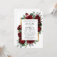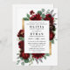 El diseño se caracteriza por la peonía acuática y los elementos florales rosas en tonos rojos y burdeos sobre la vegetación botánica del eucalipto. Template también incluye una caja de color dorado impresa para un diseño elegante añadido. La tipografía muestra un diseño moderno con texto negro. Vea el vínculo de colección en esta página para encontrar productos coincidentes dentro del conjunto de bodas.