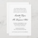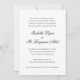 Elegantes invitaciones de la fiesta de compromiso con sus nombres en caligrafía negra y sus detalles en un tipo de letra serif, sobre un fondo blanco. El reverso es blanco y puede cambiarse a cualquier color que desee. Este diseño clásico es perfecto para una celebración formal.