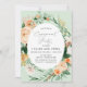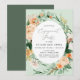 Hermosas invitaciones a fiestas de compromiso con un elegante marco moderno y neutro de color pastel acuarela floral botánico en suaves tonalidades de tierra de melocotón, naranja, suave rubor, amarillos y muchos tonos verdes de verde salado a verde claro y más profundo. Sus detalles personalizados se muestran en una distribución tipográfica elevada que coloca al invitado de honor en el centro y frente.