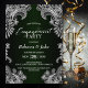 Invite a sus amigos y seres queridos a su fiesta de compromiso con esta elegante invitación blanca, negra y verde, para unirse a ustedes en la celebración de sus felices noticias.