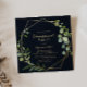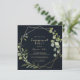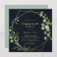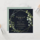 Esta invitación geométrica a la fiesta de compromiso verde dorado es perfecta para una simple celebración de compromiso. El diseño está decorado con hermosas hojas verdes pintadas a mano en un fondo azul oscuro, adornando un marco geométrico dorado.
