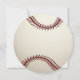 Invitación de fiesta de cumpleaños en forma de béisbol redonda con texto azul para todas las edades.