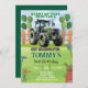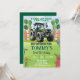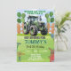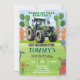 Invitación a la fiesta de cumpleaños de tractores niños. Esta invitación muestra los objetos de la granja como un tractor, una horquilla de cocina y más.