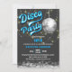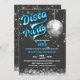 © Socialite Designs Inc. & LICENSORS. Celebra una fiesta de cumpleaños disco invitando a los huéspedes con esta divertida y retro invitación a la fiesta de cumpleaños de la discoteca. Los colores son plateado, blanco, azul neón y gris. El diseño incorpora como fondo una bola disco de plata y luces de cuerda doradas/blancas.
