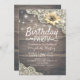 Invitación a la fiesta de cumpleaños - Luces de encaje vintage, girasol y cuerdas sobre fondo de madera rústica. Un diseño perfecto para tu gran día. ¡Todo el estilo de texto, colores, tamaños se pueden modificar para adaptarlo a sus necesidades!