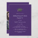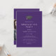 Esta moda con gorra de grad morado, invitación a una fiesta de graduación doble, es perfecta para un fiesta moderno al aire libre. El diseño es sencillo y presenta una tipografía clásica de ciruela oscura y blanca con un gorra de graduación de acuarela en negro y oro. Tira un fiesta para dos graduados. Personaliza la parte de atrás con una foto de cada graduado y su escuela.
