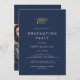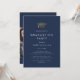 Esta invitación a una fiesta de graduación doble con gorro de moda con capucha marina es perfecta para un fiesta moderno al aire libre. El diseño es sencillo y presenta una tipografía clásica azul marino y blanco con un gorra de graduación de acuarelas en negro y oro. Tira un fiesta para dos graduados. Personaliza la parte de atrás con una foto de cada graduado y su escuela.
