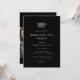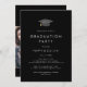 Esta moda, una invitación a una fiesta de graduación doble con una gorra negra oscura, es perfecta para un fiesta moderno al aire libre. El sencillo diseño oscuro presenta una sofisticada tipografía clásica en blanco y negro con un gorra de graduación de acuarelas en negro y oro. Tira un fiesta para dos graduados. Personaliza la parte de atrás con una foto de cada graduado y su escuela.