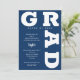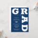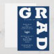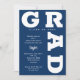 GRAD en negrita curvas con letras azul marino alrededor de los bordes de estas invitaciones de fiesta de graduación de fondo blanco. VEA TODA LA COLECCIÓN de combinaciones de colores prehechas, placas de papel, servilletas, cajas de favores e invitaciones a fiestas de graduación en nuestra tienda.