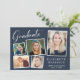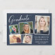 Invitación a una fiesta de graduación de color azul moderno con un collage de 5 fotos de imágenes dispersas en marcos blancos, "Graduado" en un guión blanco de moda, el nombre del graduado en elegante tipografía blanca y su año escolar y de clase en una simple tipografía blanca. Añada los detalles de su fiesta al dorso.