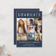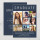 Moderna invitación de graduación de color azul oscuro y invitación a fiestas con "GRADUATE" en la parte superior en grandes letras blancas, un collage de siete fotos y el nombre del graduado, año de clase y escuela en simple tipografía blanca. Agregue los detalles del fiesta de grado en la parte posterior.