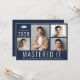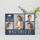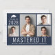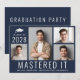 Invitación de graduación azul de maestría moderna e invitación a fiesta con 4 fotos, "Mastered It" escrito en grandes letras blancas y su año de clase, nombre y colegio o universidad en una simple tipografía blanca. En el reverso, agregue los detalles del fiesta de grado.