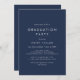 Esta invitación a la fiesta de graduación azul marino de moda es perfecta para un fiesta moderno al aire libre. El diseño es sencillo y presenta una tipografía clásica en blanco y azul marino con un ambiente rústico de boho. Personalizable de cualquier color.