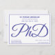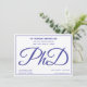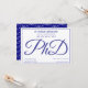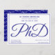 Una invitación para una fiesta de graduación de doctorado en azul y blanco. Esta invitación también tiene un patrón de la palabra doctorado, en guión, en la parte posterior.