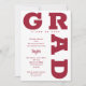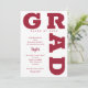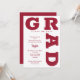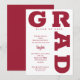 GRAD en negrita con curvas de letras rojas cromáticas alrededor de los bordes de estas invitaciones de fiesta de graduación de fondo blanco. COINCIDIENDO con los artículos de nuestra tienda.