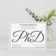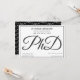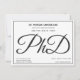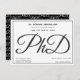 Una invitación para una fiesta de graduación de doctorado en negro, gris y blanco. Esta invitación también tiene un patrón de la palabra doctorado, en guión, en la parte posterior.