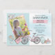 Dulce invitación de graduación de preescolar, preescolar o preescolar y diseño de fiestas con la foto de su hijo rodeada de accesorios con temática escolar como un atlas de globo, un cuaderno con el año de su graduación, una bicicleta, mochila y libros con un lindo quequito delicioso sentados encima. Diseño compuesto por Holiday Hearts Designs (derechos reservados).
