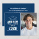 Anuncie su graduado de secundaria o universitario con estilo con esta invitación de graduación e invitación a la fiesta. La tarjeta de dos caras presenta un retrato senior del graduado con tapa de grado y diseño de tipografía blanca simple y moderno. El fondo azul marino se puede cambiar a un color diferente con la función "Personalizar" y, a continuación, Editar / Fondo para seleccionar otro color.
