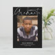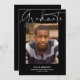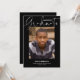 Esta minimalista tarjeta fotográfica de graduación presenta un diseño sencillo con escritura informal. En el frente, "Graduado" está escrito en caligrafía casual al otro lado de la parte superior, con una gran foto debajo. En la parte inferior, agregue el nombre del graduado, la escuela y el año de graduación. La tipografía es blanca contra un fondo negro inky. La parte posterior de la tarjeta de graduación incluye una plantilla opcional para agregar detalles de la fiesta de graduación.