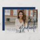 Invitación moderna a una fiesta de graduación con tu foto horizontal en la parte delantera con "graduados" mostrada en un sobrepeso de escritura naval manuscrito. Personalice la invitación de la parte delantera de la fiesta de graduación con el nombre del graduado, el nombre de la escuela y el año de graduación. La simple invitación a la fiesta de graduación se invierte para mostrar los detalles de su fiesta con letras blancas con un fondo marino sólido. ¡La invitación de la fiesta de graduación fotográfica es perfecta tanto para graduados de secundaria como universitarios!