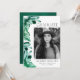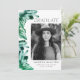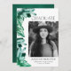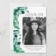 Invite a los huéspedes a su fiesta de graduación con nuestras modernas invitaciones para una fiesta de graduación fotográfica. El diseño está decorado con un borde de cristales de acuarela pintados en tonos verde esmeralda. "Graduado" se muestra en una fuente serif moderna y negra. Personalice la parte delantera de las invitaciones únicas a la fiesta de graduación agregando su foto, nombre, nombre de la escuela y año de graduación. La invitación se invierte para mostrar los detalles de tu fiesta de graduación en texto blanco con un hermoso fondo de color de agua verde esmeralda.