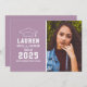 Anuncie su graduado de secundaria o universitario con estilo con esta invitación de graduación e invitación a la fiesta. La tarjeta de dos caras presenta un retrato senior del graduado con tapa de grado y diseño de tipografía blanca simple y moderno. Lavanda / fondo violeta púrpura se puede cambiar a un color diferente con la función "Personalizar", luego Editar / Fondo para seleccionar otro color.