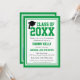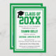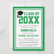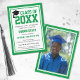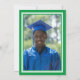 Esta invitación del Partido de Graduación de Fotografías Verdes y Blancas es una gran manera de celebrar el bachillerato o el graduado universitario. Personalice esto con el nombre, la escuela, el año, los detalles del fiesta y la foto del graduado en la parte de atrás. Esta invitación presenta tipografía audaz en colores verdes de la escuela con un borde verde y blanco.
