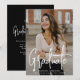Invitación moderna a una fiesta de graduación con tu foto vertical en la parte delantera con "Graduado" mostrado en una sobreimpresión de escritura manuscrita blanca. Personalice la invitación de la parte delantera de la fiesta de graduación con el nombre del graduado, el nombre de la escuela y el año de graduación. La simple invitación de la fiesta de graduación se invierte para mostrar los detalles de su fiesta con letras blancas con un fondo negro sólido. ¡La invitación de la fiesta de graduación fotográfica es perfecta tanto para graduados de secundaria como universitarios!