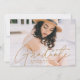 Invite a los huéspedes a celebrar el jardín con nuestras elegantes invitaciones para graduación de fotos. Las invitaciones a graduación presentan la foto del graduado con "Graduado" en un overlay de caligrafía moderna de oro. Personalice el frente de la invitación moderna a la graduación añadiendo el nombre del graduado, el nombre de la escuela y el año de graduación. La invitación se invierte para mostrar los detalles de tu fiesta de graduación y un patrón geométrico punteado de oro y blanco a la moda.