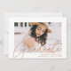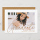 Invite a los huéspedes a celebrar la graduación con nuestras modernas invitaciones a la fiesta de graduación de fotos. La fiesta de graduación de moda invita a presentar la foto del graduado con "Graduado" en un overlay de caligrafía moderna de oro. Personalice el frente de las invitaciones agregando el nombre del graduado, el nombre de la escuela y el año de graduación. La invitación se invierte para mostrar los detalles de tu fiesta de graduación y un patrón geométrico punteado de oro y blanco a la moda.