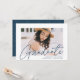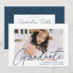 Invite a los huéspedes a celebrar la graduación con nuestras modernas invitaciones a la fiesta de graduación de fotos. La fiesta de graduación de moda invita a presentar la foto del graduado con "Graduado" en un guión moderno de caligrafía marina. Personalice el frente de las invitaciones agregando el nombre del graduado, el nombre de la escuela y el año de graduación. La invitación se invierte para mostrar los detalles de tu fiesta de graduación y un patrón geométrico punteado de color blanco y marino a la moda.