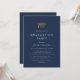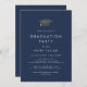 Esta invitación a la fiesta de graduación de la gorra azul marino de moda es perfecta para un fiesta moderno al aire libre. El diseño es sencillo y presenta una tipografía clásica azul marino y blanco con un gorra de graduación de acuarelas en negro y oro.