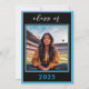 Moderna y moda, esta invitación a la fiesta de graduación combina el blanco y el negro clásico con acentos de azul brillante. Su diseño mínimo es un diseño simple y divertido para celebrar el gran día del graduado. La parte trasera muestra la foto favorita de tu graduado. Creado por Simply Farmhouse Press.