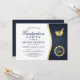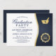 Celebra tu graduación de la escuela de farmacia con estilo con esta invitación moderna con el logo de mortero azul y oro. El diseño elegante presenta un logotipo de mortero y almirez en un hermoso acabado de oro metálico sobre un fondo azul marino clásico. Personalice la invitación con sus propios detalles utilizando la herramienta de diseño de Zazzle, haciéndolo único para usted y su evento especial. La descarga digital también está disponible, lo que le permite imprimirla fácilmente en casa o compartirla con sus amigos y familia en medios sociales o por correo electrónico.