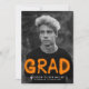 Una fiesta de graduación de fotografía urbana y a la moda invita a presentar la foto del graduado con "Grad" en un estilo tipográfico naranja y pintado con aerosol. Personalice el frente agregando el nombre del graduado, el nombre de la escuela y el año de graduación. La moderna invitación de graduación se revierte para presentar los detalles de tu fiesta de graduación en blanco contra un fondo naranja o color de tu elección.