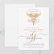 Celebra tu logro con estilo con este moderno médico médico MD, invitación a la fiesta de graduación, con un diseño elegante con un oro caduceus, y elegantes iniciales de caligrafía de guión dorado monograma. El diseño limpio aporta un toque de sofisticación. Oro y negro. Disponible en forma impresa, como descarga digital, o ambos.
