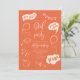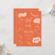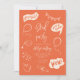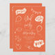 Funky tarjeta de invitación de fiesta de graduación con ilustracion a mano de graduación e íconos relacionados con la escuela en naranja.