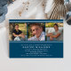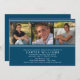 Anuncie su graduado de secundaria o universitario con estilo con una tarjeta de graduación de tres fotos con detalles de franjas y la redacción moderna de sans serif invitación. Colores clásicos de diseño azul y blanco. Personalizar para añadir tres fotos y tu invitación de graduación y detalles de la invitación de fiesta.