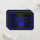 Una tarjeta de graduación azul y negra invitando a los seres queridos a honrar a un maravilloso graduado en su día especial de celebración. La información para la invitación a la fiesta de graduación se escribe con letras azules.