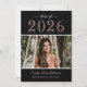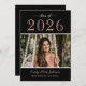 Anuncie su graduado de secundaria con estilo con esta tarjeta de invitación de graduación de fotos de estilo simplemente elegante que incluye dos fotos principales de su hermoso graduado con un clásico esquema de color negro y rosa rosa / oro rosa - se puede personalizar. El dorso de las tarjetas incluye una invitación a una fiesta de graduación para celebrar la ocasión.